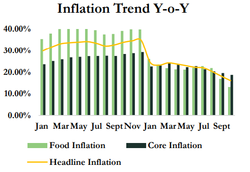 Inflation continued its steady downward trajectory in October 2025, marking the seventh consecutive month of disinflation. Headline inflation declined to 16.05% (y/y) from 18.02% in September, reflecting broad-based moderation across both food and core components.