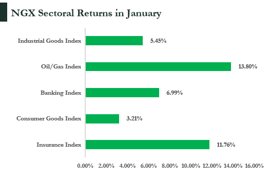 Sectoral performance on the NGX in January 2026 largely reflected the broader market’s bullish tone, with most indices closing the month in positive territory as investors selectively rotated into high-conviction sectors. The Oil and Gas index emerged as the top performer, advancing by 13.80%, driven by price gains in key integrated energy stocks such as SEPLAT (+15.34%) and ARADEL (+16.45%). Institutional confidence was further reinforced by improved governance sentiment following strategic board appointments, including the induction of Mr. Tony Elumelu to Seplat Energy’s board.