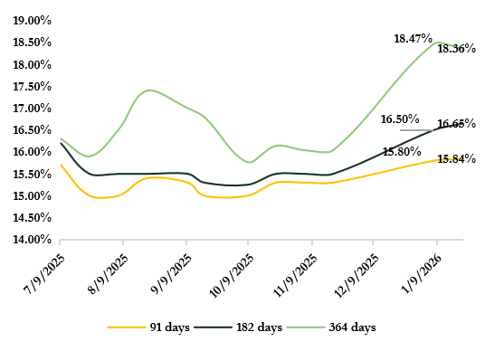 Demand intensified at the January 21 auction, where ₦1.15 trillion was again offered. Total subscriptions surged to ₦3.44 trillion, translating to a bid-cover ratio of 3.24x, with particularly strong interest in longer-dated bills. While stop rates for the 91-day and 182-day instruments edged higher to 15.84% and 16.65%, the 364-day bill cleared lower at 18.36%, reflecting growing investor preference for duration. The